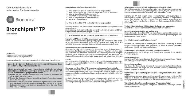 Bitte sprechen Sie mit Ihrem Arzt oder Apotheker, bevor Sie Bronchipret® TP einnehmen. Bei Beschwerden, die länger als zwei Wochen anhalten oder bei Auftreten von Atemnot, Fieber wie auch bei eitrigem oder blutigem Auswurf, sollte umgehend ein Arzt aufgesucht werden. Bei Patienten mit Magenschleimhautentzündung oder Magengeschwür ist Vorsicht geboten.Kinder: